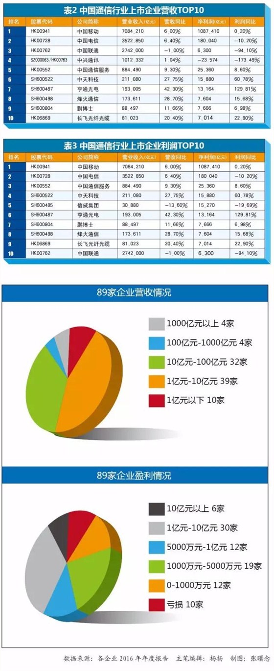 近日,世纪瑞达又收集了国内89家上市通信企业2016年的财报,列举了其营业收入、净利润及其增长情况。